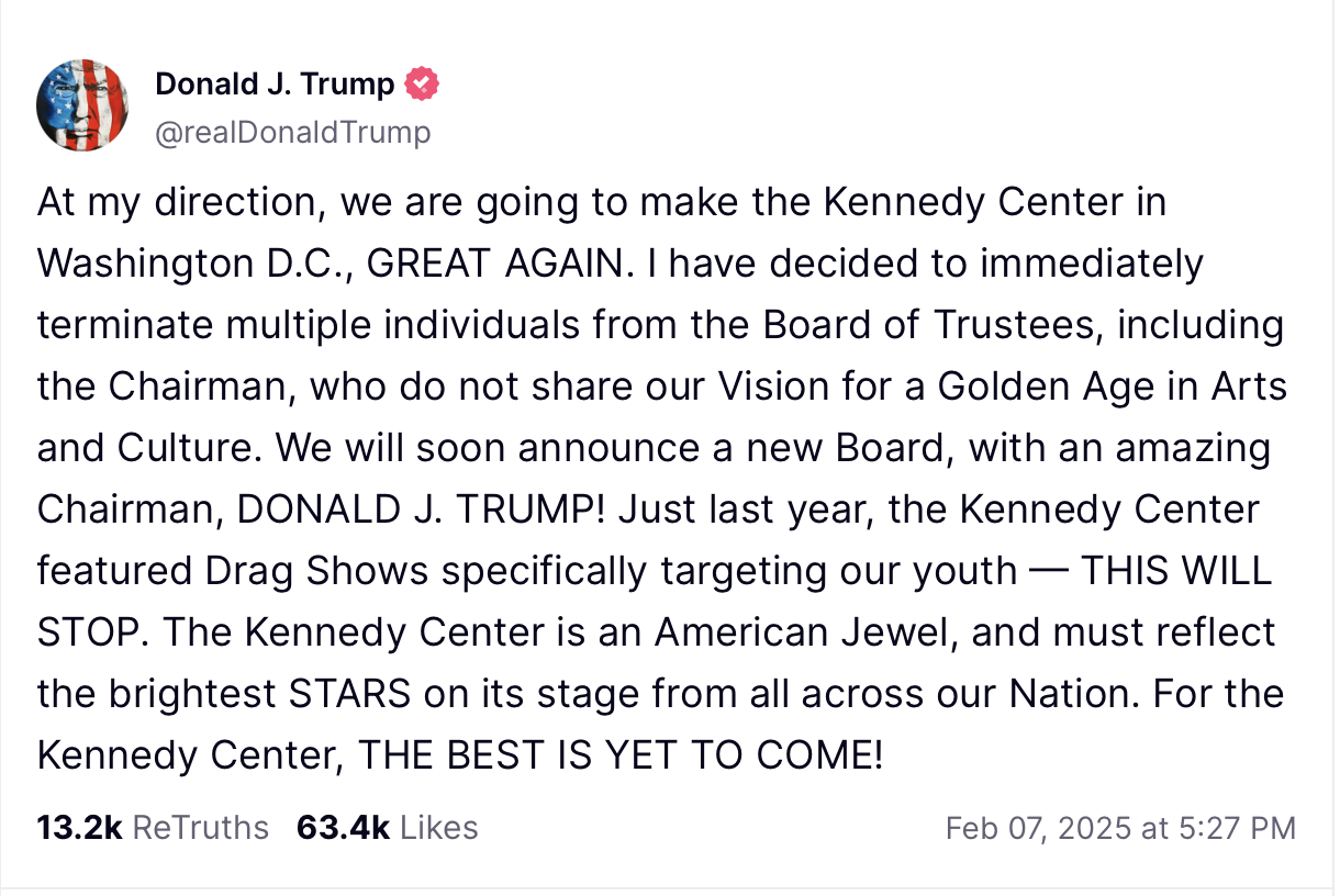 Trump dismisses board members of the Kennedy Center, appoints himself as Chairman—another act of sheer pettiness. Brace yourself for figures like Kid Rock and Scott Baio receiving honours that should be reserved solely for individuals of talent and achievement. {AP 8 February} pic.twitter.com/BmcyOgLD4o