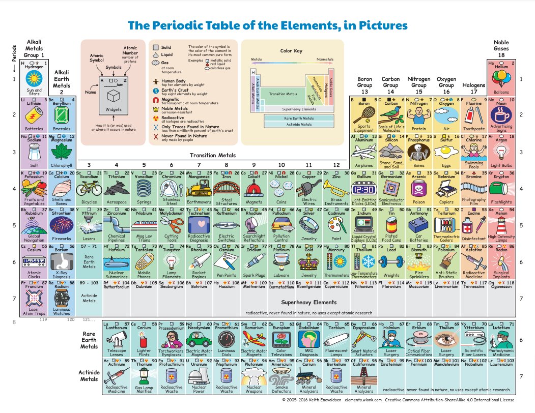 This pictorial periodic table is colorful, fun, and packed with information. In addition to the element’s name, symbol, and atomic number, each element box has a drawing of one of the element’s main human uses or natural occurrences. The table is color-coded to show the chemical groupings. Small symbols pack in additional information: solid/liquid/gas, color of element, common in the human body, common in the earth’s crust, magnetic metals, noble metals, radioactive, and rare or never found in nature.