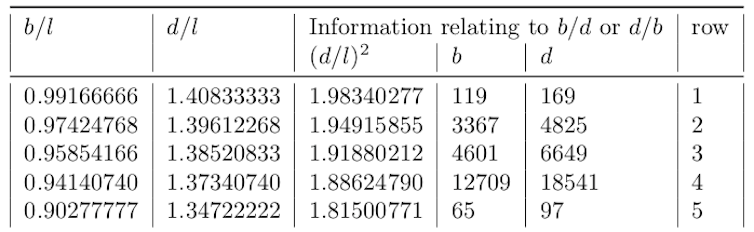Instead, information about this ratio is split into three columns of exact numbers. A squared index and simplified values of b and d to help the scribe make their own approximation to b/d or d/b.