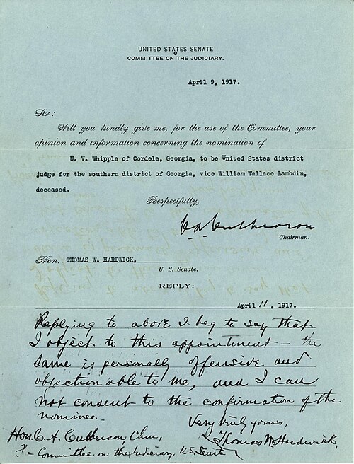 The blue slip is a document, traditionally printed on blue paper, used in the U.S. Senate as part of the confirmation process for certain federal judicial nominees. It is sent by the Senate Judiciary Committee to the two senators from the nominee’s home state, allowing them to provide their opinion on the nominee, which can be positive (approving the nominee), negative (opposing the nominee), or the slip may not be returned at all (which is typically treated as opposition). This practice applies primarily to nominees for U.S. district courts and, until changes in 2017-2018, also to circuit court nominees. The blue slip is a senatorial courtesy, not a formal Senate rule or constitutional requirement, and its enforcement depends on the policy set by the chair of the Senate Judiciary Committee.