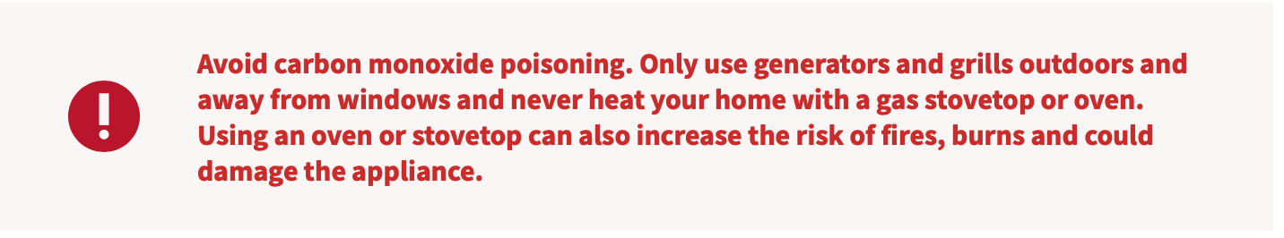 Avoid carbon monoxide poisoning. Only use generators and grills outdoors and away from windows and never heat your home with a gas stovetop or oven. Using an oven or stovetop can also increase the risk of fires, burns and could damage the appliance.