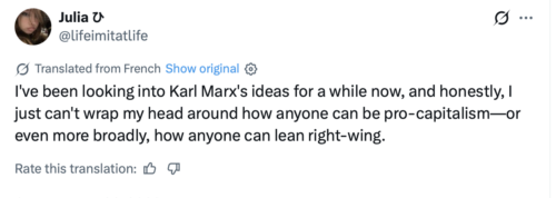 This conversation happened on French X but thanks to its new automatic translation feature, we are all able to read this man’s rebuttal of her defense of Marxism. He gives a masterclass in economics in words we can all follow. Enjoy, and remember it for your next meeting with any lefty relatives.