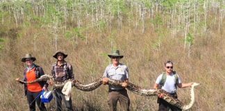 This female python was over 17 feet long, weighed 140 pounds, and contained 73 developing eggs. She is the largest …